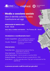 “Media e coesione sociale: idee di identità collettiva, dalla Costituzione ad oggi”, è il titolo del corso di formazione che si tiene il prossimo 29 marzo (dalle 15.30 alle 18.30) nella sala della chiesa metodista (Via Firenze 38 a Roma).