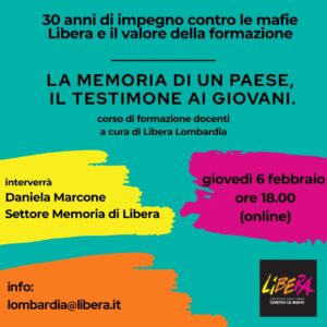 “Da memoria individuale a memoria collettiva. Percorsi di Memoria Viva a partire dalle storie delle vittime innocenti delle mafie” è questo il titolo del terzo appuntamento del Corso di formazione docenti a cura di Libera Lombardia in programma giovedì 6 febbraio alle ore 18.00 (on line).