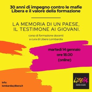 Il primo incontro, che si terrà online il 14 gennaio alle ore 18.00, ci permetterà di avviare, insieme a Michele Gagliardo – Settore formazione nazionale di Libera – una riflessione sul senso dell’educare, a partire dai bisogni e dai contesti di riferimento.