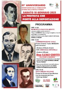 Sabato 18 gennaio è in programma la commemorazione del 81° anniversario della deportazione della commissione interna della Comerio Ercole, promossa dall’Associazione “Noi della Comerio Ercole 1885” e dalle Rappresentanze Sindacali Unitarie della Comerio Ercole S.p.a., con il patrocinio dell’Amministrazione comunale e la partecipazione dell’Anpi e di alcune scuole cittadine riunite nel tavolo “La storia ci appartiene”.