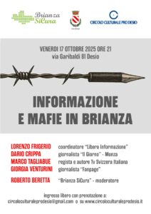 Venerdì 17 ottobre, ore 21: convegno «Informazione e mafie in Brianza» presso la sede del Circolo Culturale Pro Desio (via Garibaldi 81). Partecipano: Lorenzo Frigerio, coordinatore di «Libera Informazione»; Dario Crippa, giornalista de «Il Giorno» di Monza; Marco Tagliabue, regista e autore Tv Svizzera Italiana; Giorgia Venturini, giornalista di «Fanpage», recentemente minacciata dalle mafie in Brianza; modera Roberto Beretta, presidente di «Brianza SiCura»