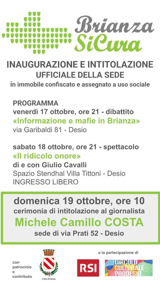 Domenica 19 ottobre l’associazione inaugura ufficialmente la sua sede – sita in un immobile confiscato e restituito all’uso sociale in via Prati 52 a Desio – e la intitola alla memoria del giornalista Michele Camillo Costa, protagonista dell’informazione antimafia in Brianza, recentemente scomparso.