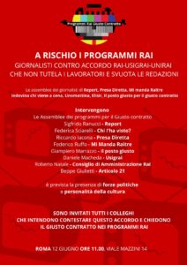 Per questo «le giornaliste e i giornalisti Rai senza giusto contratto scenderanno in piazza il 12 giugno a partire dalle 11 davanti alla sede Rai di viale Mazzini a Roma, per un presidio a cui interverranno personalità del mondo del giornalismo, della politica e dello spettacolo, e invitano ad aderire tutte le realtà politiche, sindacali e associative impegnate per i diritti dei lavoratori e per la libertà di espressione e di stampa».