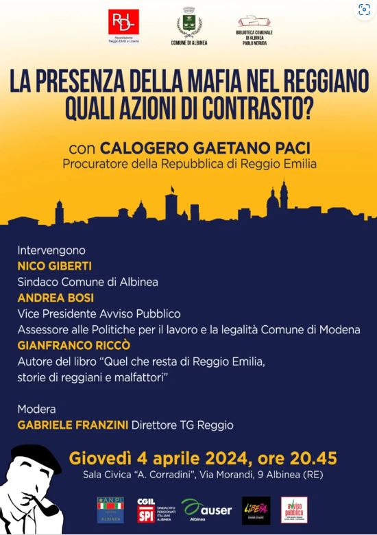 S’intitola “La presenza della mafia nel reggiano: quali azioni di contrasto?” l’incontro che avrà luogo giovedì 4 aprile 2024, alle ore 20.45, nella sala civica di via Morandi 9 di Albinea (RG).
