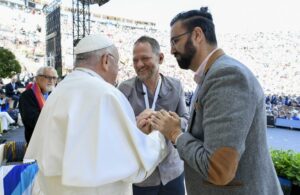 E quando ha abbracciato Maoz Inon, a cui Hamas ha ammazzato i genitori il 7 ottobre, e il palestinese Aziz Sarah, che ha perso il fratello nell’inferno della guerra, dopo aver chiesto un momento di silenzio ha concluso: “Credo che davanti alla sofferenza di questi due fratelli, che è la sofferenza di due popoli, non si può dire nulla…, non si può dire nulla. Loro hanno avuto il coraggio di abbracciarsi. E questo non è solo coraggio e testimonianza di volere la pace, ma anche è un progetto di futuro. Abbracciarci”.