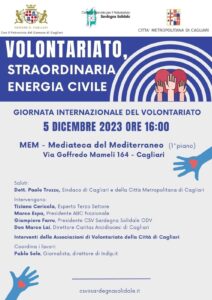 Delle potenzialità del volontariato e delle sfide che tale settore è chiamato ad affrontare, si discuterà nella conferenza pubblica “Volontariato, straordinaria energia civile” che si terrà a Cagliari, nella Sala Conferenze della MEM, martedì 5 dicembre 2023 dalle ore 16, in occasione appunto della Giornata Internazionale del Volontariato.