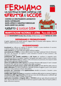 Il 6 luglio la Cgil, assieme alle associazioni della società civile, sarà nuovamente in piazza a Latina per una grande manifestazione nazionale contro il sistema del caporalato e dello sfruttamento nei campi. Il corteo partirà alle ore 9.30 da via Vittorio Cervone per poi arrivare in Piazza della Libertà, dove il segretario generale della Cgil, Maurizio Landini, concluderà la manifestazione.