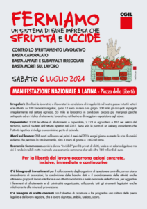 Il 6 luglio la Cgil, assieme alle associazioni della società civile, sarà nuovamente in piazza a Latina per una grande manifestazione nazionale contro il sistema del caporalato e dello sfruttamento nei campi. Il corteo partirà alle ore 9.30 da via Vittorio Cervone per poi arrivare in Piazza della Libertà, dove il segretario generale della Cgil, Maurizio Landini, concluderà la manifestazione.
