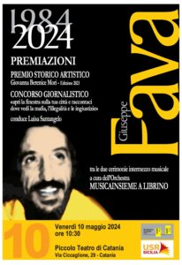 Venerdì 10 maggio, a Catania, al Piccolo Teatro della Città, in via Ciccaglione 29, alle ore 10:30, la Fondazione Giuseppe Fava invita alla premiazione del concorso giornalistico «apri la finestra sulla tua città e raccontaci dove vedi la mafia, l’illegalità e le ingiustizie» e del «Premio Giovanna Berenice Mori».