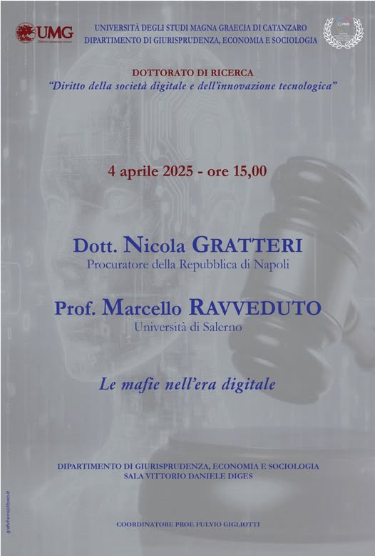 Su iniziativa del professor Fulvio Gigliotti, Ordinario di Diritto privato nell’Università di Catanzaro, si terrà domani, con inizio alle ore 15.00, presso la sede del Dipartimento di Giurisprudenza, Economia e Sociologia dell’Università Magna Graecia, un incontro sul tema delle “Le mafie nella società digitale”.