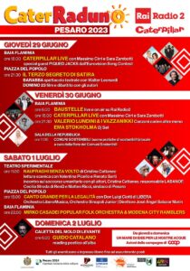 Appuntamento dal 29 giugno al 2 luglio con il CaterRaduno 2023, che ogni anno torna a rallegrare la città di Pesaro e il territorio con un mix collaudato di musica (in programma anche il concerto dei Modena City Ramblers), parole (tra cui quelle che fanno attivarsi e impegnarsi di Don Luigi Ciotti e quelle che fanno riflettere e sorridere di Valerio Lundini) ed eventi, in perfetto stile radiofonico e con le voci di Massimo Cirri e Sara Zambotti.
