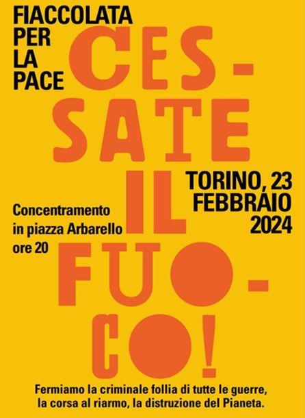Nell’ambito delle iniziative nazionali previste per il secondo anniversario della guerra Russia-Ucraina, venerdì 23 febbraio 2024 è in programma una marcia della pace in risposta all’appello di una vasta coalizione composta dalla rete Europe for peace e Assisi pace giusta. Appuntamento alle 20 in piazza Arbarello a Torino.