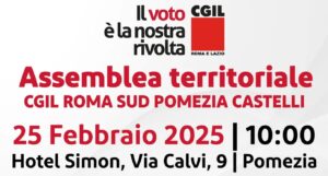 “Martedì 25 febbraio 2025 dalle ore 10 si riunirà presso l’Hotel Simon, in via Calvi, 9 a Pomezia – aggiunge -, l’assemblea territoriale della Cgil di Roma Sud Pomezia Castelli, mercoledì sarà la volta della Camera del Lavoro della Cgil di Roma Centro Ovest Litoranea che si riunirà alle ore 10 presso l’Aula Magna del Dipartimento di Giurisprudenza Università Roma Tre, in Via Ostiense 159, Roma. Giovedì 27 febbraio doppio appuntamento con la Cgil di Civitavecchia Roma Nord Viterbo, che convoca l’assemblea alle ore 9:30 al Molo Vespucci, presso Autorità Portuale di Civitavecchia, e con la Cgil di Rieti Roma Est Valle dell’Aniene che si riunirà presso il Cnr di piazzale Aldo Moro, 7, sempre alle ore 9:30. A chiudere il ciclo di assemblee sarà il segretario generale della Cgil, Maurizio Landini, con l’appuntamento del 3 marzo 2025 al Teatro D’Annunzio di Latina, in viale Umberto I, 41, all’assemblea organizzata dalla Cgil di Frosinone e Latina”, conclude il sindacato.