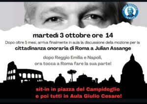 “Arriva finalmente in Assemblea Capitolina la mozione N° 83/2023 per il conferimento della cittadinanza onoraria a Julian Assange. La discussione e relativa votazione sono previste nella seduta di martedì 3 Ottobre dalle ore 14, dopo oltre 5 mesi dall’invio della nostra richiesta a tutto il Consiglio Capitolino, dopo 4 mesi dalla protocollazione della mozione e dopo 3 mesi dalla sua calendarizzazione e dopo la pausa estiva”.