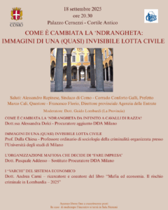 Giovedì 18 settembre, alle ore 20.30, presso il Cortile Antico di Palazzo Cernazzi a Como, ci terrà il convegno dal titolo “Come è cambiata la ‘ndrangheta: immagini di una (quasi) invisibile lotta civile”.