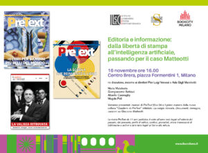La rivista Pretext da 11 anni pubblica 3 volte all’anno testi legati all’editoria del passato, del presente, profili di editori, scrittori, giornalisti, storie interessanti di biblioteche e archivi e tanti temi legati ai libri e alla lettura.