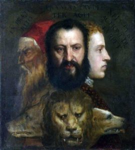 Alla National Gallery di Londra è conservato un olio su tela di Tiziano, che raffigura tre teste d’uomo, che si danno le spalle. Un vecchio, canuto e accigliato, affonda nell’ombra, un giovane, pallido e dall’espressione piena di incertezza, fissa la luce, e un uomo maturo, dalla barba curata, al centro della scena, pare l’unico perfettamente a fuoco. A ciascuno è giustapposto un animale, un lupo dal ghigno crudele al primo, un cane ansimante al secondo, un leone orgoglioso al terzo. Sopra le teste si legge: “Ex praeterito praesens prudenter agit ni futura(m) actione(m) deturpet” (tenendo conto del passato il presente agisce prudentemente affinché non sia rovinato il domani). Nonostante sia controversa la destinazione dell’opera ed il suo significato, la si considera un’allegoria dell’agire prudente, tenendo a mente ciò che è stato per costruire al meglio il futuro, che ancora non è che un’ombra pallida di ciò che deve venire.