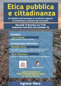 Giovedì 13 dicembre alle ore 17,30 nell’Auditorium Sant’Ilario (Via Garibaldi 13) il Comune di Piacenza insieme all’associazione Avviso Pubblico organizza un dibattito sull’importanza di un’attività congiunta di prevenzione e contrasto alla corruzione.