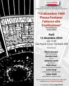 L’iniziativa, pubblica e gratuita, dal titolo “12 dicembre 1969. Piazza Fontana: l’attacco alla Costituzione” si svolgerà giovedì 12 dicembre alle ore 17.30 presso il Circolo Asyoli, di Forlì.