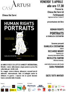 In occasione della mostra “La vita possibile una mostra navigante” di Gianluca Costantini presso il MAF di Forlimpopoli, il Coordinamento Libera di Forlì Cesena, in collaborazione con il Comune di Forlimpopoli, l’Associazione Barcobaleno e l’Associazione Amnesty International, organizza la presentazione del libro “Human Rights Portraits” di Gianluca Costantini e Riccardo Noury, portavoce di Amnesty International Italia, che ha collaborato alla realizzazione del volume scivendo i testi.