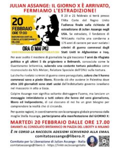 Il DAY X fissato dall’Alta corte di Londra per il 20-21 febbraio 2024, vi sarà il pronunciamento in merito all’ultimo appello di cui Julian Assange dispone. Se questo dovesse essere respinto, Assange potrebbe essere estradato immediatamente negli Stati Uniti dove lo attende un processo già scritto in cui non potrebbe difendersi.