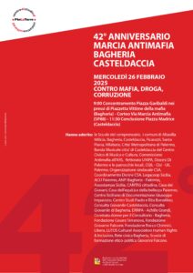 Tutto pronto per il 42° anniversario della “marcia Bagheria-Casteldaccia” contro mafia, droga e corruzione, promossa dal Centro studi “Pio La Torre”, che si celebrerà mercoledì 26 febbraio. Un’edizione alla quale aderiscono numerosi dal mondo istituzionale, associativo, scolastico, sindacale. Ci saranno i Comuni del comprensorio, la Commissione regionale antimafia, le consulte giovanili, fondazioni, singoli cittadini. Realtà che hanno partecipato a un percorso che, aprendo le scuole e tenendo gli incontri al loro interno, ha dimostrato che la memoria può e deve essere protetta e tramandata anche attraverso il confronto intergenerazionale.