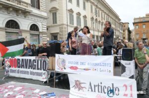 “Numerose sono le colleghe e i colleghi Rai oggi qui in piazza a testimonianza del sostegno che anche dal servizio pubblico viene a questa iniziativa – ha sottolineato il consigliere Rai, Roberto Natale -. Il servizio pubblico c’è, ma può e deve fare ancora di più, anche aprendo spazi nei palinsesti per dare agli ascoltatori il senso della straordinaria tragicità di quanto sta avvenendo, magari dando più voce ai palestinesi”. Secondo l’ex parlamentare Pd Vincenzo Vita, “non è un generico attacco all’informazione, ma una criminale uccisione dei giornalisti, donne e uomini che cercano di raccontare quello che succede a Gaza. Quella scritta press fino a qualche anno fa era una garanzia di immunità”.