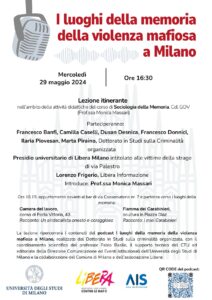 Mercoledì 29 maggio a partire dalle ore 16.15, all’interno delle attività previste dal corso di Sociologia della memoria (Prof.ssa Monica Massari), si terrà la lezione itinerante dal titolo “I luoghi della memoria della violenza mafiosa” che, sulla scia del podcast realizzato dal Dottorato in Studi sulla Criminalità Organizzata dell’Università di Milano, ripercorrerà alcuni dei luoghi teatro di violenza mafiosa nella città.