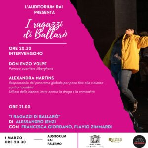 Per capire quali sono i motivi che trascinano ragazzi sempre più giovani verso l’abisso delle dipendenze da sostanze, alle 21 di sabato 1 marzo ci si ritroverà  all’Auditorium della sede Rai di Palermo per riflettere insieme aiutati da una particolare testo teatrale come “I Ragazzi di Ballarò”, voluto dall’associazione “La casa di Giulio”, il cui debutto è stato all’Archivio storico di Palermo domenica 12 gennaio, grazie al sostegno della Presidenza dell’Assemblea Regionale Siciliana.