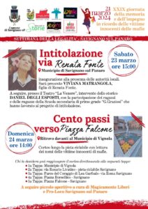 Sabato 23 marzo dalle 15.00 alle 18.00, il Comune di Savignano sul Panaro, in provincia di Modena, per la “Settimana della Legalità” promuove l’intitolazione via Renata Fonte e Camminata 100 passi verso Piazza Falcone.