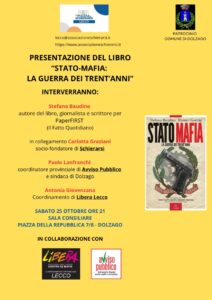 Sabato 25 ottobre, dalle 21.00 alle 23.00, il Comune di Dolzago (LC) e l’associazione Schierarsi, in collaborazione con il Coordinamento provinciale di Avviso Pubblico di Lecco e Libera Lecco, organizzano la presentazione del libro “Stato Mafia: La guerra dei trent’anni” di Stefano Baudino e Henier Koenig (PaperFIRST 2025).
