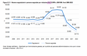 Il trend delle segnalazioni mostra un considerevole incremento a partire dal 1994 (25.920 persone segnalate) che si conferma anche negli anni successivi fino al 1999. Nel 2000 vi è stata una lieve flessione, poi il numero dei segnalati è aumentato; nel 2004, è stato raggiunto l’apice con 47.989 persone segnalate – e 50.1413 segnalazioni. Più di recente è stato raggiunto un picco considerevole tra il 2017 e il 2019 (Fig.1).