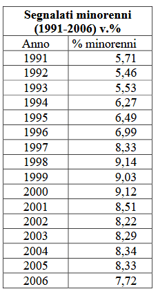Per quanto riguarda i minori segnalati, ovvero i giovani fino a 14 anni e tra i 15 ed i 17 anni, la percentuale sul totale mostra un andamento crescente fino all’anno 2000. A partire dal 2001 tale percentuale diminuisce fino al valore del 7,7% del totale dei segnalati nel 2006 (Fig. 2).
