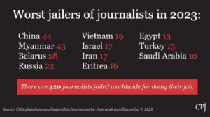 Overall, CPJ documented 320 journalists behind bars for their work as of the census date December 1, 2023, down from more than 360 in 2022. The number was the second-highest recorded by CPJ since the census began in 1992—a disturbing barometer of entrenched authoritarianism and the vitriol of governments determined to smother independent voices.