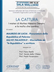 Durante l’incontro verrà presentato il recente libro “La cattura” (Feltrinelli, 2023) scritto dal Procuratore di Palermo Dott. Maurizio de Lucia, insieme allo scrittore e giornalista di Repubblica Salvo Palazzolo.