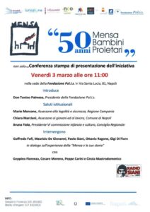 Venerdì 3 marzo 2023 alle ore 11.00 a Napoli, nella sede della Fondazione Pol.i.s. (via Santa Lucia, 81), conferenza stampa di presentazione delle iniziative per il cinquantesimo anniversario.
