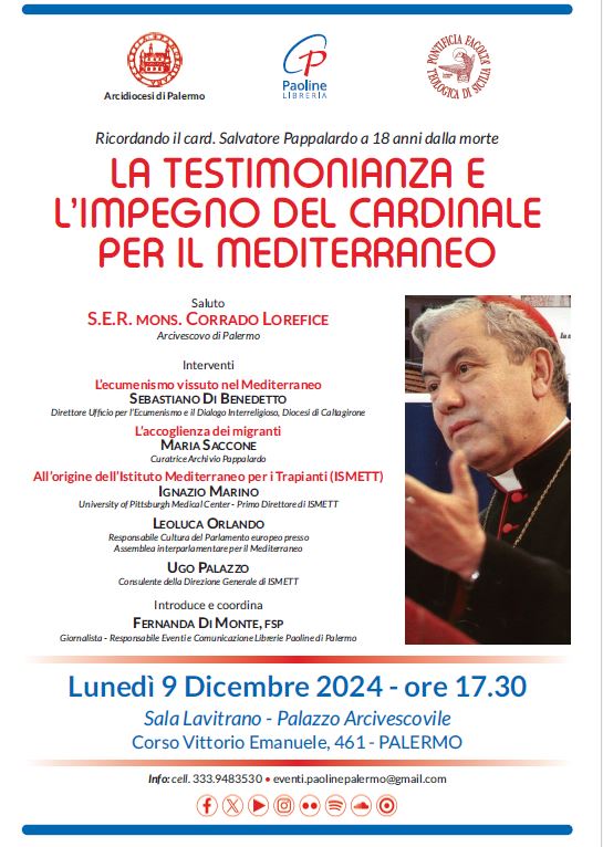 Per iniziativa dell’Arcidiocesi di Palermo, delle Librerie Paoline e della Pontificia Facoltà Teologica di Sicilia “San Giovanni Evangelista”, lunedì 9 dicembre 2024 alle ore 17.30 presso il Salone Lavitrano del Palazzo Arcivescovile un incontro approfondirà “La testimonianza e l’impegno del cardinale per il Mediterraneo”.