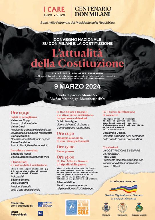 Don Milani e la Costituzione è il tema su cui si sviluppa l’evento di sabato 9 marzo presso la scuola di pace di Montesole, a Marzabotto, promosso dal Comitato nazionale per il centenario della nascita di don Lorenzo Milani.