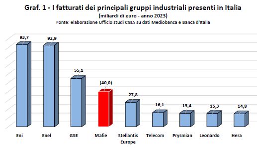 Se effettuiamo una comparazione puramente teorica che, tuttavia, ci consente di “dimensionare” la portata del fenomeno, il fatturato dell’industria del crimine risulta essere ipoteticamente al quarto posto a livello nazionale, dopo quello registrato dall’Eni (93,7 miliardi di euro), dall’Enel (92,9 miliardi) e dal Gestore dei Servizi Energetici (GSE) (55,1 miliardi) [3] (vedi Graf. 1).