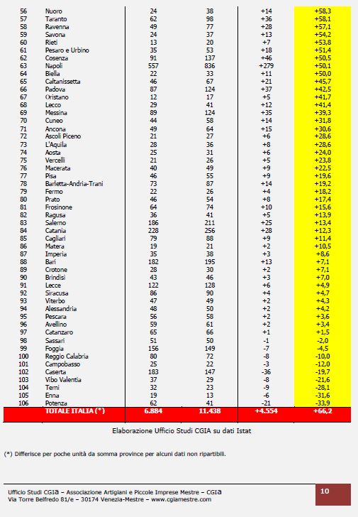 Sempre nello stesso arco temporale, tra le province, invece, le variazioni di crescita più importanti hanno interessato, in particolare, Bolzano con il +362,5 per cento, Belluno con il +330 per cento, Verbano-Cusio-Ossola con il +311,1 per cento, Benevento con il +278,6 per cento e Ferrara con il +257,1 per cento.