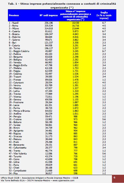 A Napoli, ad esempio, sarebbero quasi 18.500, a Roma poco più di 16.700 e a Milano sfiorano le 15.650 unità. In queste tre realtà geografiche è concentrato il 34 per cento circa delle imprese a rischio in tutto il Paese. Seguono Caserta con 5.873 imprese, Brescia con 4.043, Palermo con 4.016, Salerno con 3.862, Bari con 3.358 e Catania con 3.291 (vedi Tab. 1).