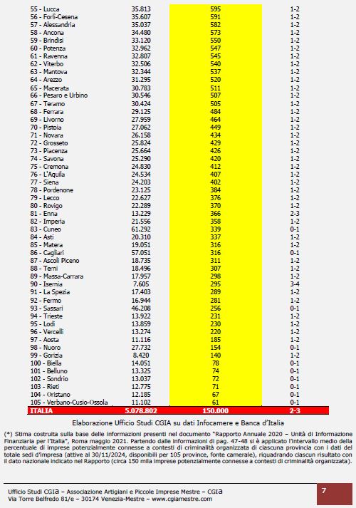 In virtù dei dati in possesso dell’Unità di Informazione Finanziaria (UIF) della Banca d’Italia – struttura che, per legge, riceve ogni anno dagli intermediari finanziari4 centinaia di migliaia di segnalazioni di operazioni finanziarie sospette – è stato possibile mappare il numero delle imprese presenti in Italia che potenzialmente sono contigue a contesti di criminalità organizzata.