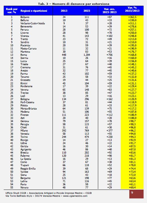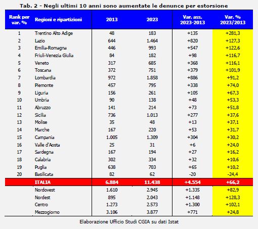 Come dicevamo in precedenza, tra il 2023 e il 2013 le denunce per estorsione sono aumentate del 66,2 per cento, con una punta massima del +128,3 per cento nel Nordest.