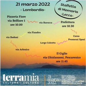 In occasione del 21 marzo, XXVII Giornata della memoria e dell’impegno, Libera Lecco e le scuole del Centro di Promozione della Legalità (CPL)di Lecco: I.C. Lecco 1 “Falcone e Borsellino”, I.C. Lecco 2 “Don G. Ticozzi”, I.C. Lecco 3 “A. Stoppani”, IIS “A. Badoni”, IIS “G. Bertacchi”, IIS “G. Parini”, IIS “Medardo Rosso”, IIS “P.A. Fiocchi”, Liceo Classico e Linguistico “A. Manzoni”, IMA e Volta organizzano una staffetta per ricordare tutte le vittime innocenti delle mafie.