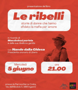 Mercoledì 5 giugno alle ore 21.00 appuntamento presso la Parrocchia La Creta, piazza S. Giovanni Battista alla Creta/Via delle Allodole (MM1 Inganni), per la presentazione della nuova edizione del libro “Le Ribelli. Storie di donne che hanno sfidato la mafia per amore” del prof. Nando dalla Chiesa.