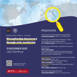 Mercoledì 13 dicembre – Special Event sul monitoraggio civico organizzato insieme a Università di Pisa: “Strengthening democracy through civic monitoring”