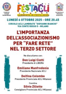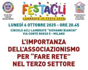 Lunedì 6 ottobre alle ore 20.45, il Circolo Acli di Lambrate in Via Conte Rosso 5, ha organizzato un incontro per parlare dell’importanza dell’associazionismo per “fare rete” nel terzo settore.