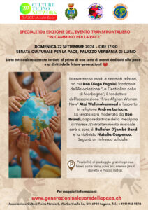 L’Associazione Culture Ticino Network di Lugano e il Tavolo per la Pace dell’Alto Verbano invitano tutti a partecipare all’evento per la pace che si terrà domenica 22 settembre, alle ore 17.00, presso il Palazzo Verbania di Luino. È il primo di una serie di eventi organizzati in preparazione della 10a edizione dell’evento transfrontaliero “In Cammino per la Pace”, previsto per martedì 8 ottobre dalle ore 9:00 alle ore 13:00 a Ponte Tresa.