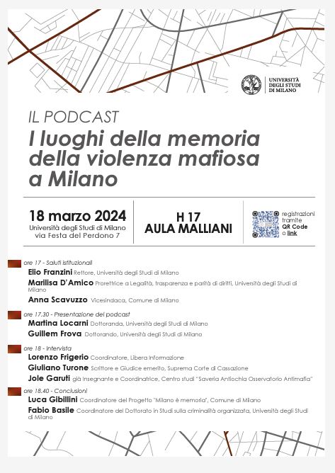 Lunedì 18 marzo 2024 alle ore 17.00 (Università Statale di Milano, Sala Malliani – via Festa del Perdono, 7) viene presentato il podcast “I luoghi della memoria della violenza mafiosa a Milano”, realizzato dai dottorandi del corso di Dottorato in Studi sulla criminalità organizzata dell’Ateneo in collaborazione con l’associazione Libera Milano.