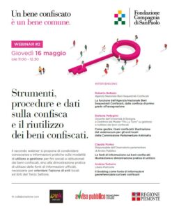Il secondo appuntamento online è per martedì 16 maggio, dalle 11.00 alle 12.30 con l’incontro “Strumenti, procedure e dati sulla confisca e il riutilizzo dei beni confiscati”. Il webinar sarà focalizzato sulle procedure amministrative necessarie per il riutilizzo di questi beni, procedure burocratiche complesse e che spesso sono di difficile comprensione.